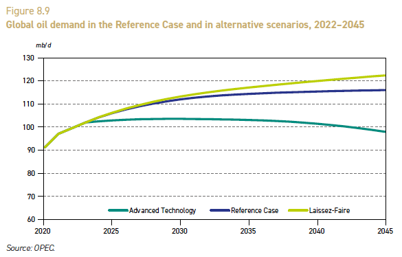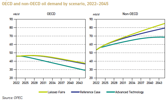 11/OPEC's World Oil Output 2045 models oil demand to rise in two scenarios and to decline only marginally in the other.