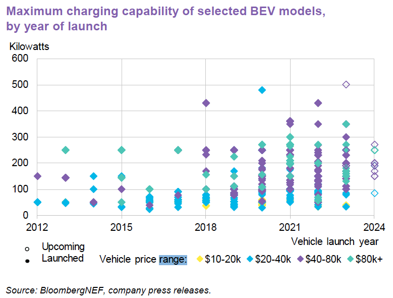 Average max-charging power of a 2023 BEV was 186 kilowatts (kW), 25% higher than 2022.