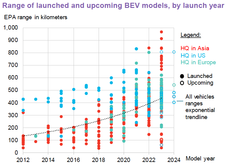 EVs drive for longer distances: average range for 2023 is 470 kilometres.