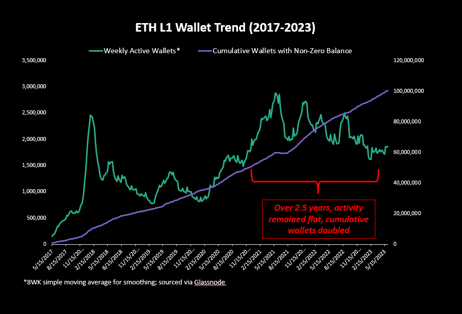 How do I know those ~2M wallets are really users though? We can look at Ethereum's monthly average wallets and compare to how many non-zero wallets there are. Over the last 2.5 years, the cumulative number of non-zero wallets doubled while "true users" is likely about flat.