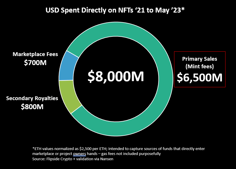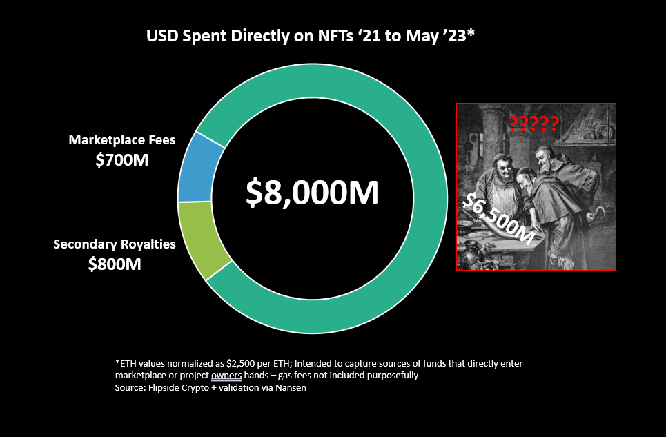 So I go back to our pie chart... $6.5B in mint fees $1.5B in royalties and marketplace fees $8B that was definitely spent. But what if some of the $6.5B in mints are spent back into the market? Really, does that make sense?