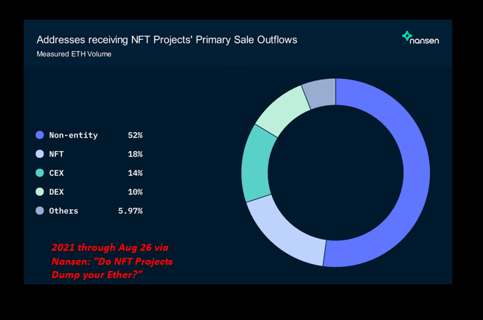 Well... Nansen did great work on tracking what happened to NFT mint proceeds both in 2021 and 2022. What we see is actually surprising... And it's a sign of behavioral patterns we will revisit later. Here's where the money went in 2021 (through August)