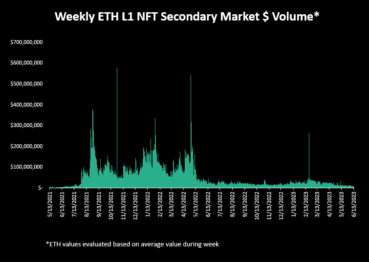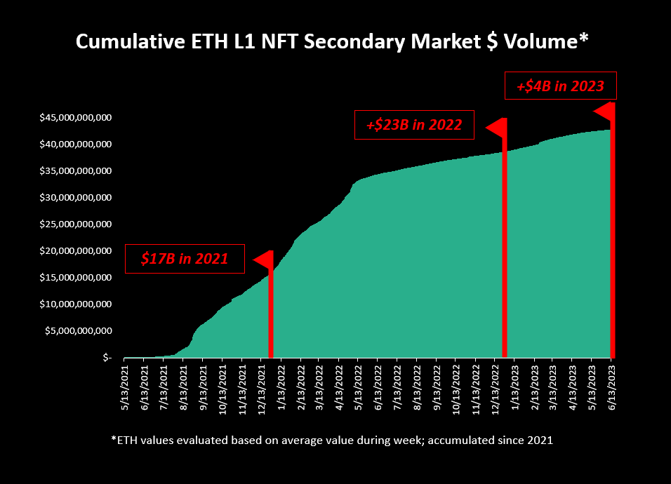 Dollar value of NFT volume on ETH L1 was $44B over the last 2.5 years: 2021: $17B 2022: $23B 2023: $4B (to date) So, first check... if $6.5B was spent on mint fees alone, does it make sense that the volume could be 6-7x that? Maybe! Let's look at a few other things...