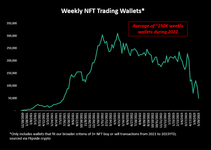 There are two numbers that are important: 1) Total unique users reached 2) Weekly active usage Let's take a look at weekly active usage of NFTs. Unfortunately, our best "usage" is have bought or sold NFTs in last week... For most of 2022, there were about 250K weekly wallets.