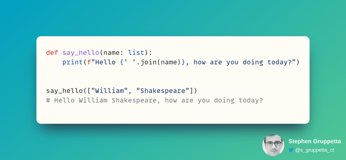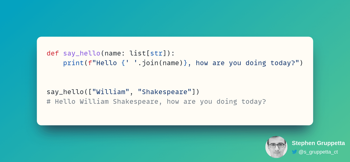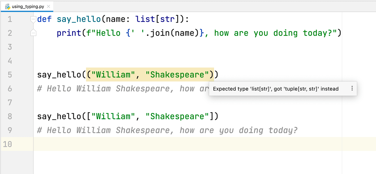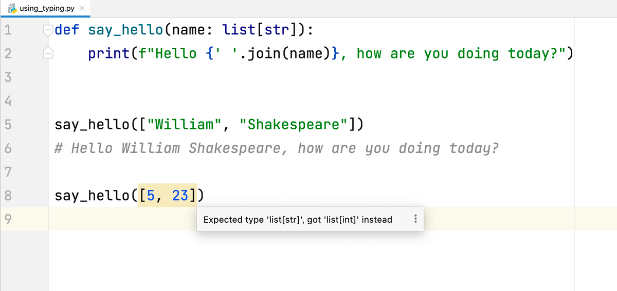 The parameter `name` in the function signature has a type annotation showing that a string is expected.