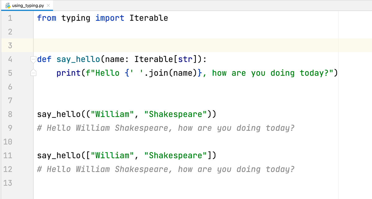 In this case, we can use `typing.Iterable` which shows that the expected argument should be any data type which is iterable