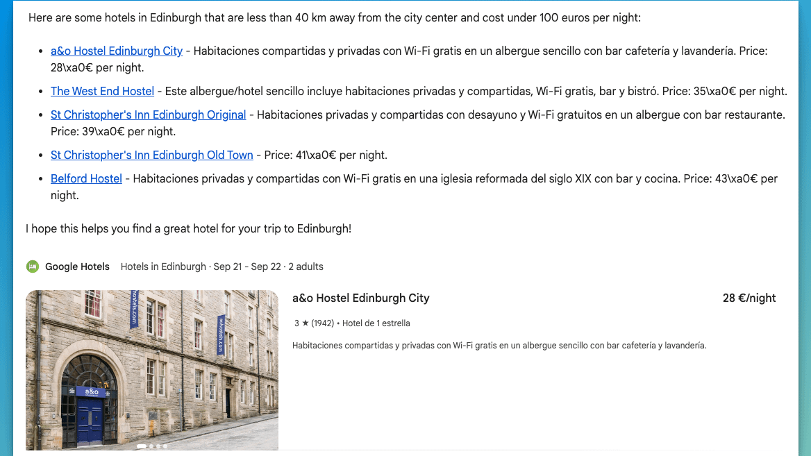 Parecido a vuelos. La respuesta inicial tiene alguna cosa rara de formato (descripciones en español, los precios).