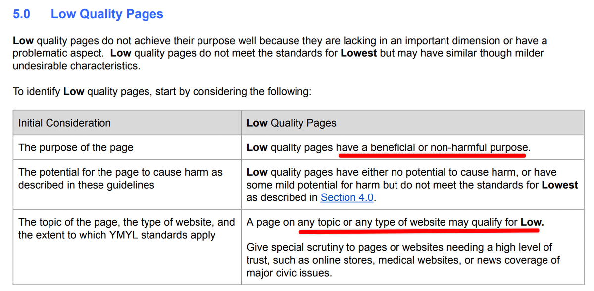 Low Quality ya es un terreno más gris, en el que podrían caer webs "legítimas", pero que han descuidado algún apartado importante de los que Google exige para poder considerarlas webs de calidad.