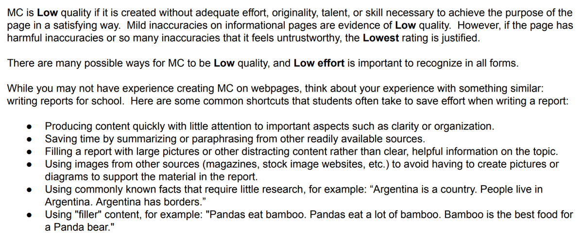 Por ejemplo, no se cumplen los criterios mínimos de contenido principal si el contenido no se ha creado con el esfuerzo, originalidad o conocimiento necesario para satisfacer lo que busca el usuario.