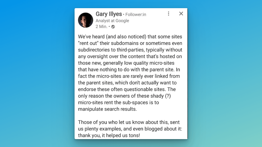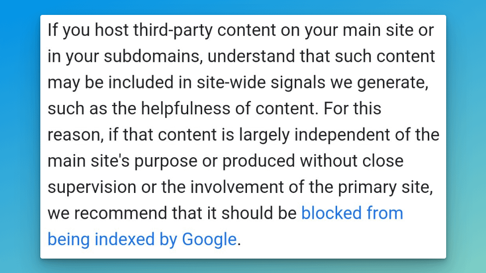 Ayer mismo Google anunció un nuevo update, en este caso de su sistema de "contenido útil", donde especifica que el contenido creado por terceros puede influir sobre la puntuación general de contenido útil de un sitio (aunque este contenido esté en subdominios).