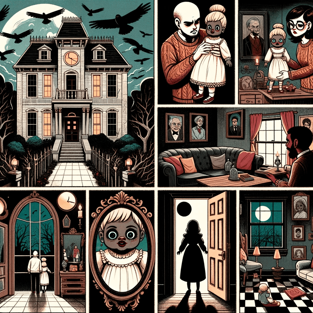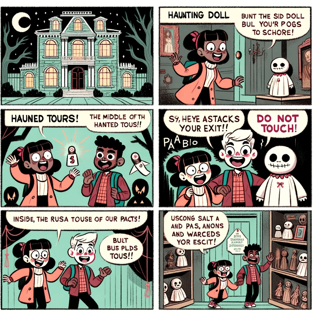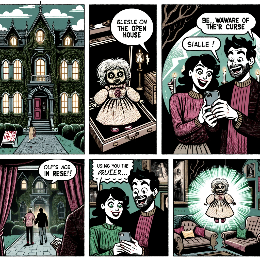 Prompt: Create a comic strip on a short horror story of a couple visiting a haunted house having a haunted doll