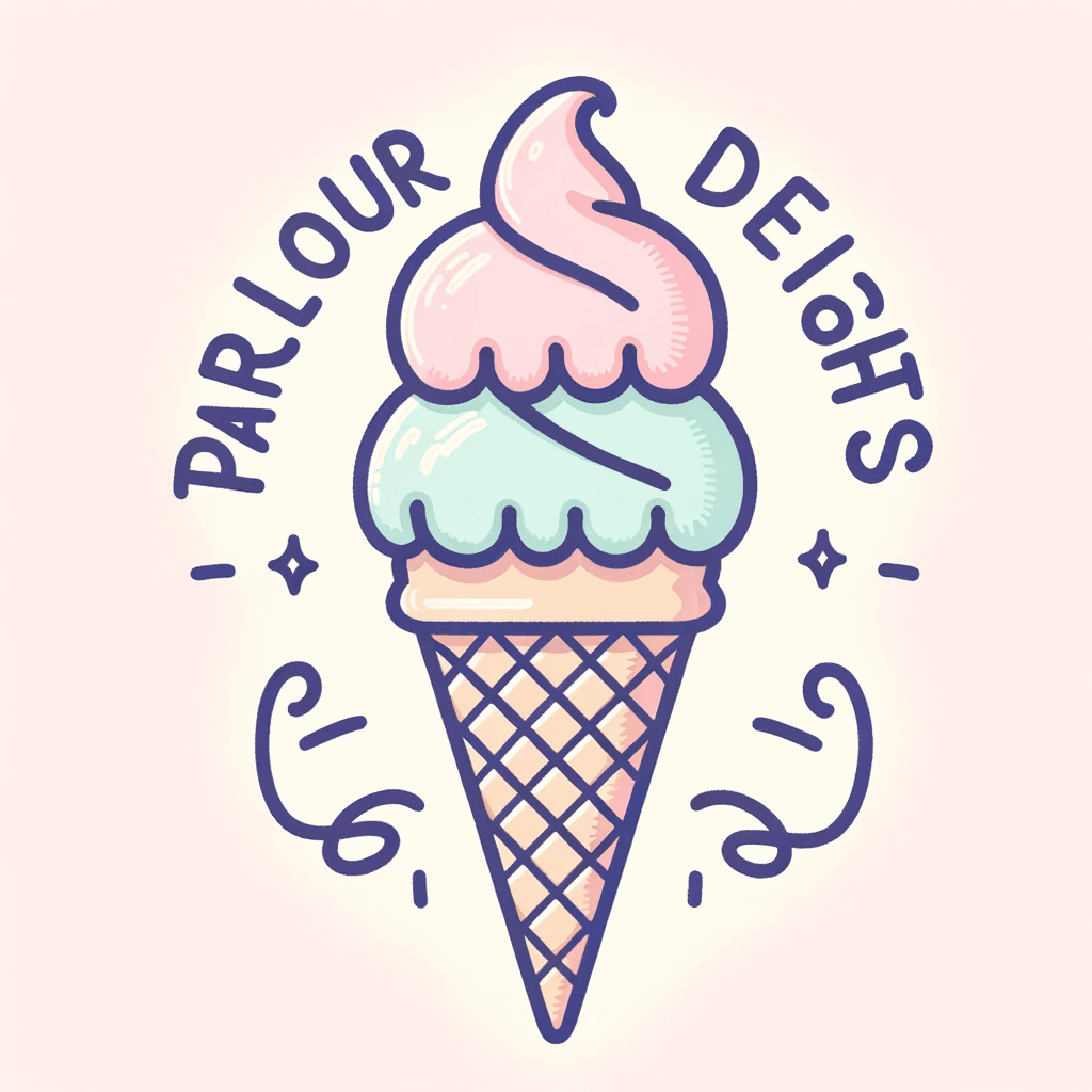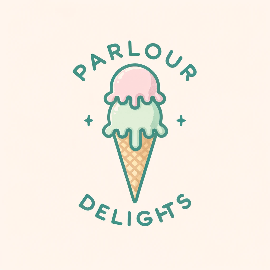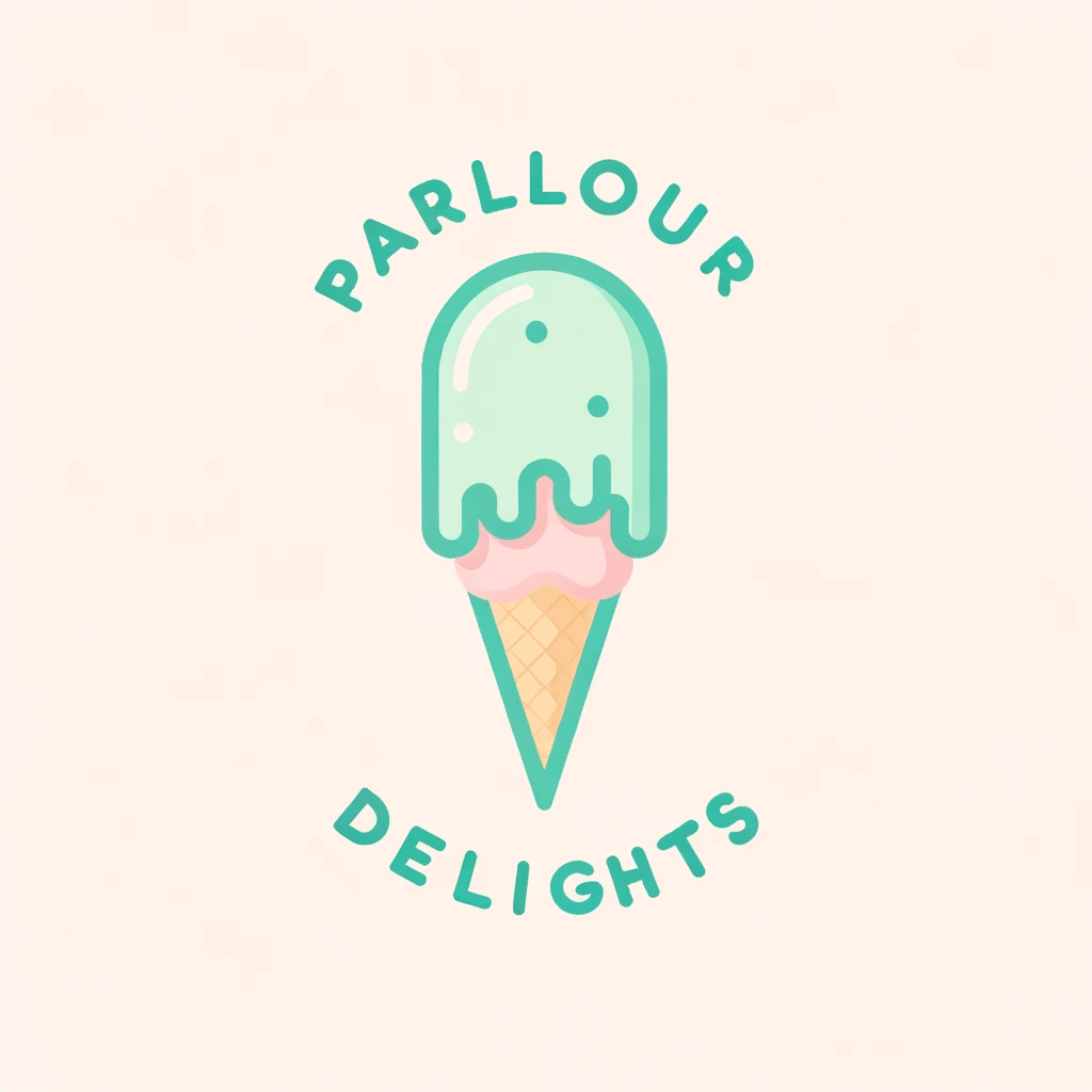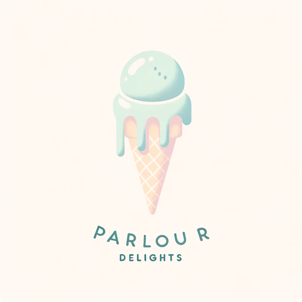 Prompt: Minimalist vector logo of a melting ice cream cone with pastel colors and a playful font spelling 'Parlour Delights'