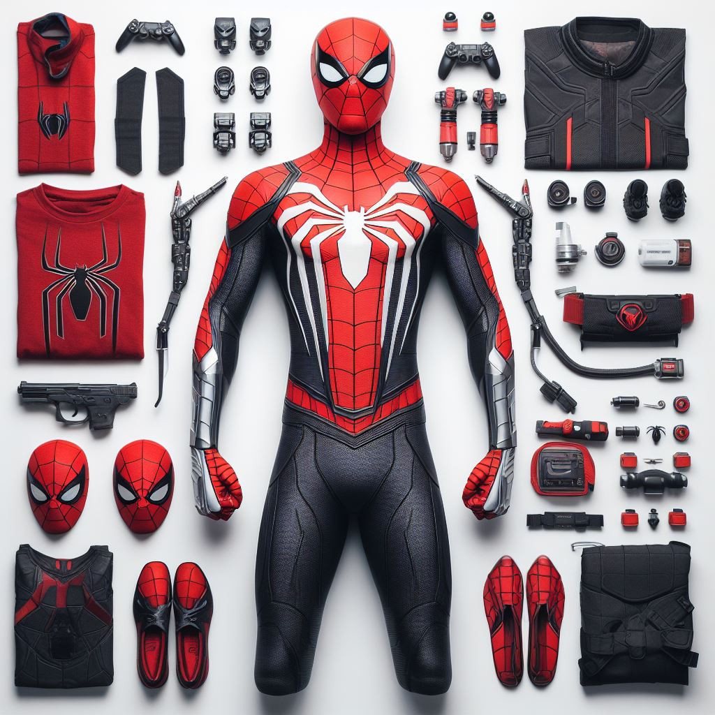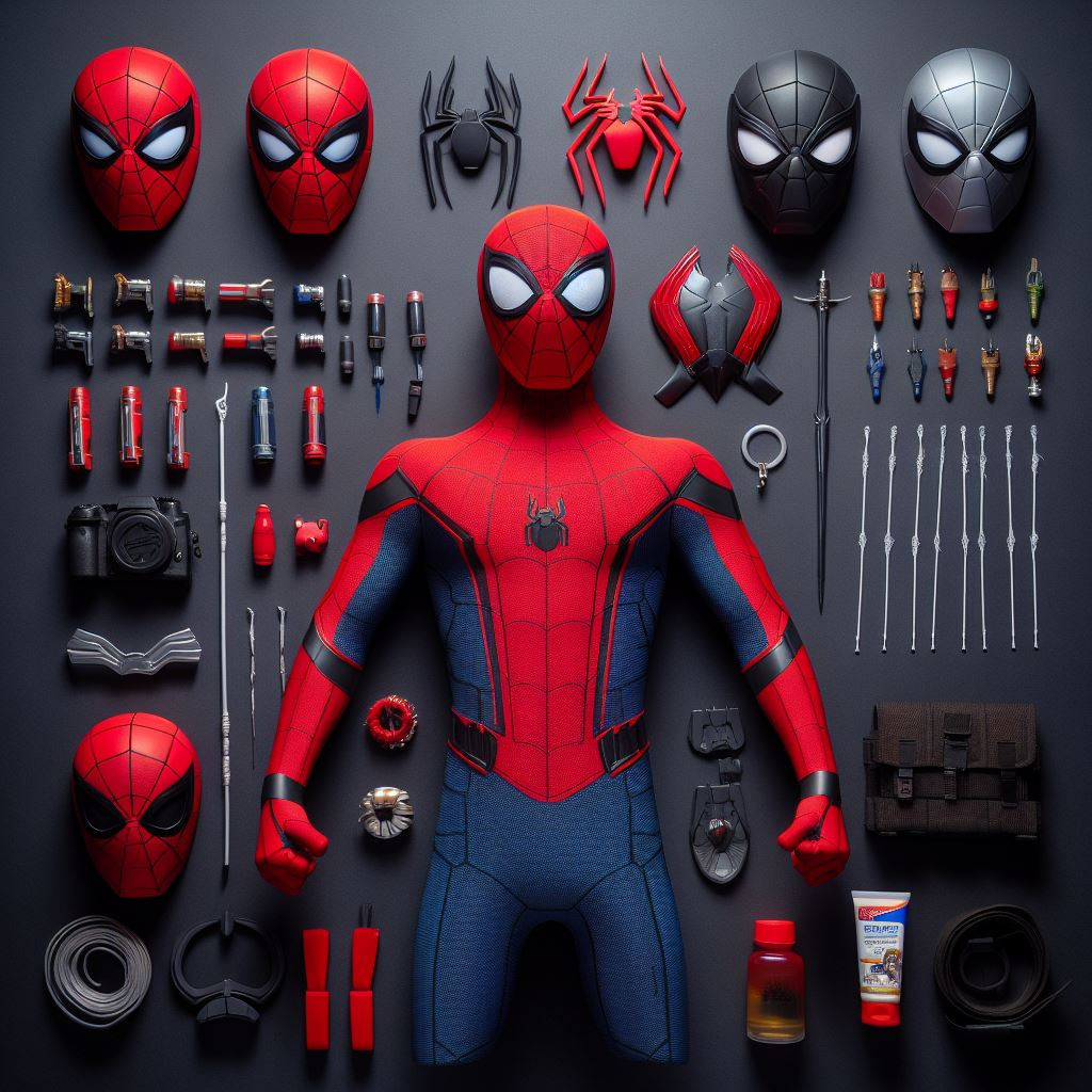 Prompt: Knolling photo of Spiderman in his iconic suit, surrounded by suit pieces, Web shooters, Masks, Web Fluid Cartridges, Spider-Signal, Utility Belt, and Spider-Tracers, arranged neatly