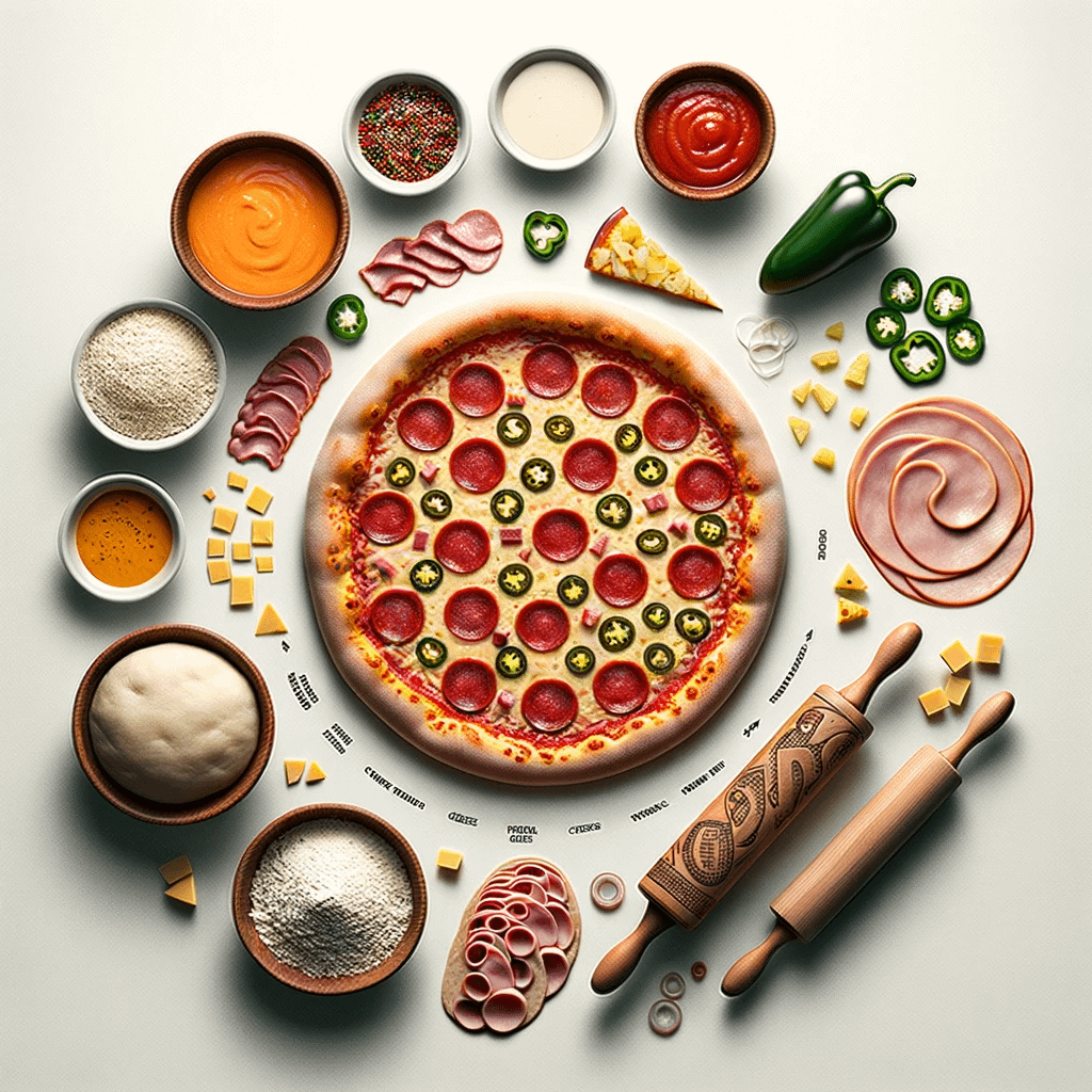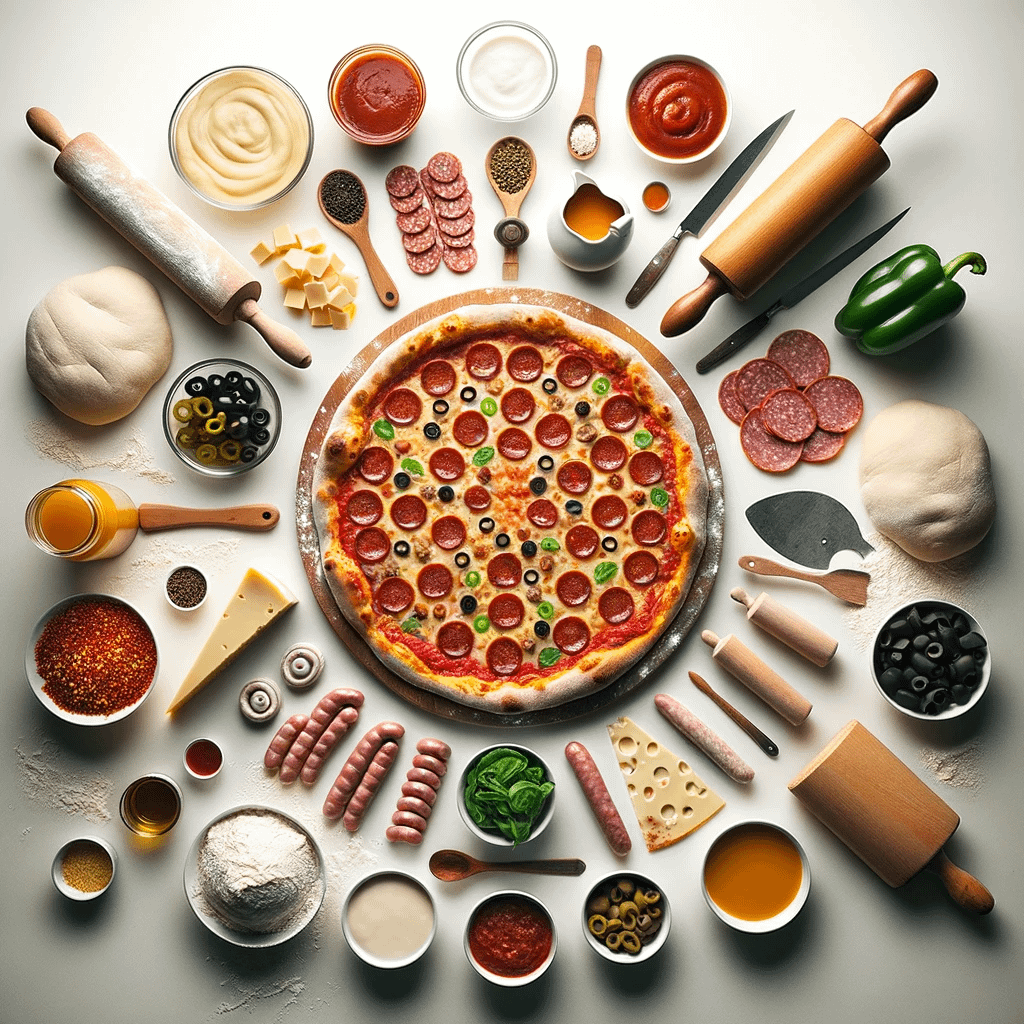 Prompt: Knolling product photo of a pizza surrounded by Pizza Dough, Pizza Sauce, Cheese, Toppings, Pizza Stone, Rolling Pin, Pizza Peel, arranged on a clean background