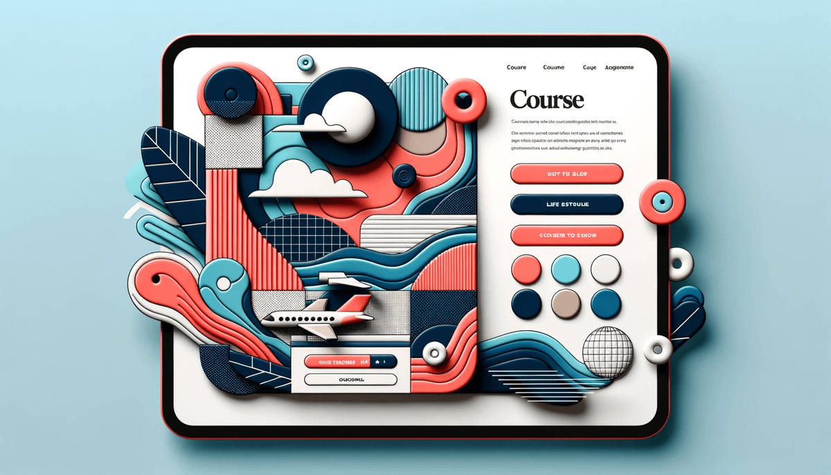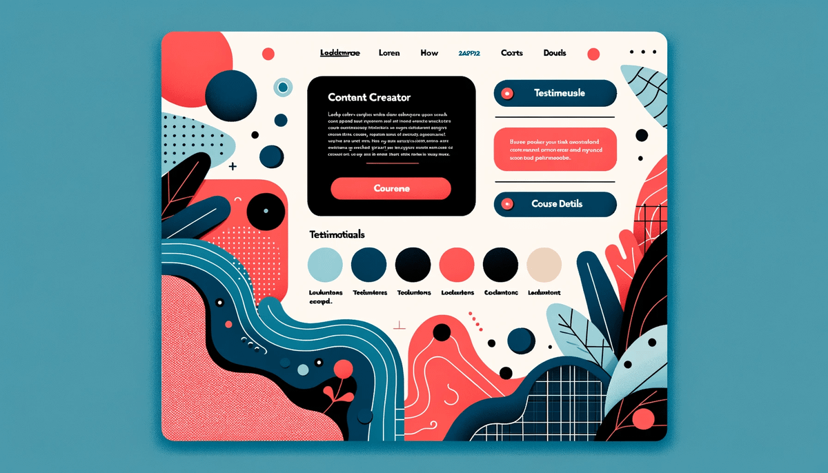 Prompt: A landing page for a content creator selling his course, Primary Colors: Navy Blue and Coral Red, Secondary Colors: Turquoise and Beige, with cool abstract textures, modern and playful