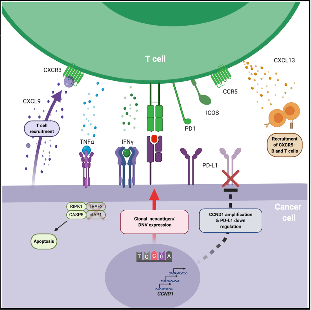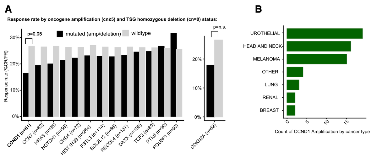 Another example is the focal amplification of CCND1: tumors with CCND1 amplification were found to have significantly lower rates of response to immune checkpoint inhibitors.