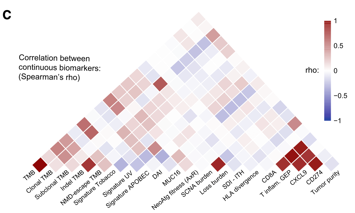 Biomarkers within each category correlated highly with eachother (e.g. TMB & clonal TMB, or immune infiltration CD8A & CXCL9).