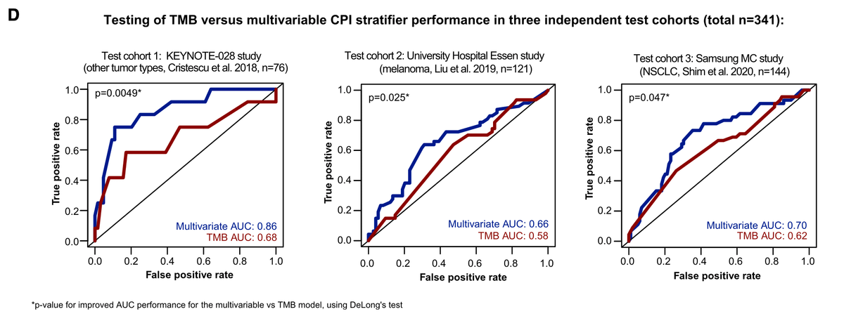 The pan-cancer multivariable model outperformed a TMB-only model on predicting checkpoint inhibitor response across three independent test cohorts totaling 350 samples.