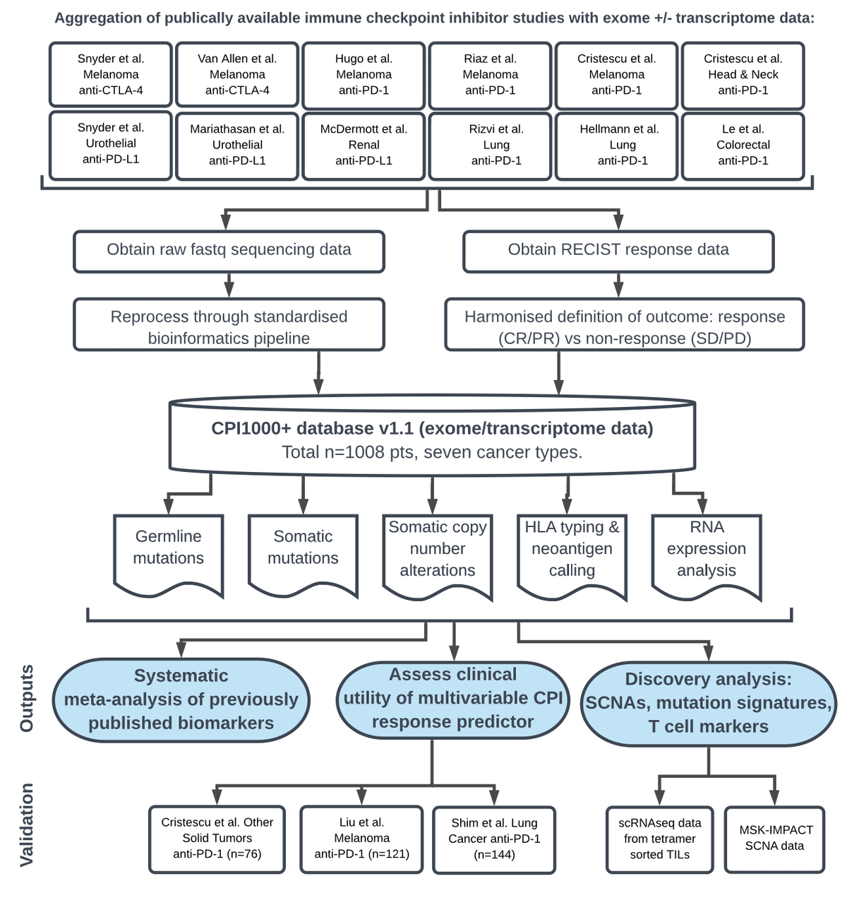 This meta-analysis gathered 1,008 ICI-treated patients from 12 cohorts (with clinical outcome) with the goal of identifying predictors of immune checkpoint inhibition sensitization.