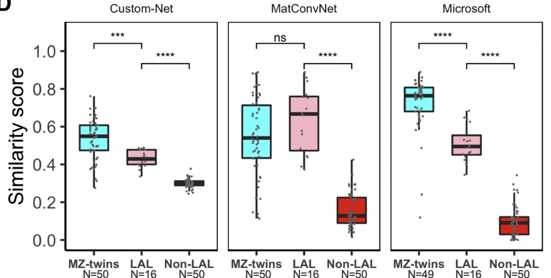 The plot below shows the 16 of 32 pairs (50%) which scored consistently high on all algorithms (LALs). For comparison, MZ-twins are monozygotic twin faces and Non-LALs are faces of random people.