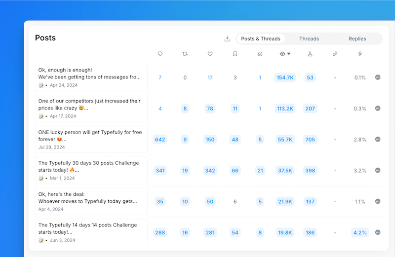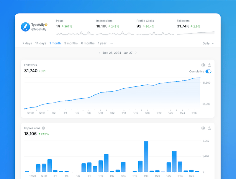 At Typefully, we see social media analytics as all the metrics you need to understand how your content is performing on social media. While metrics like impressions are important to see how many people your content is reaching, others like engagement rate and followers growth tell you how much people enjoy what you publish.