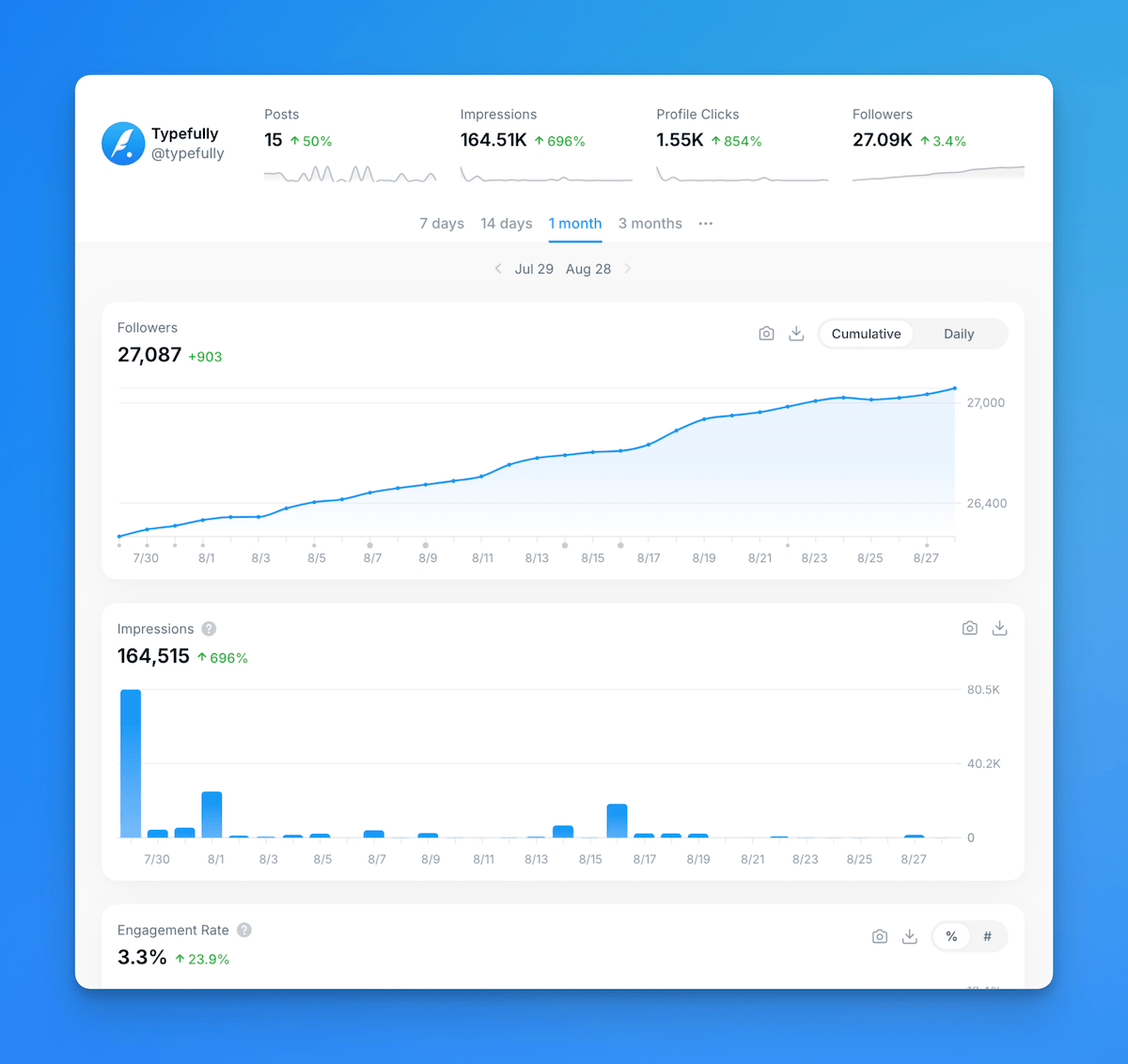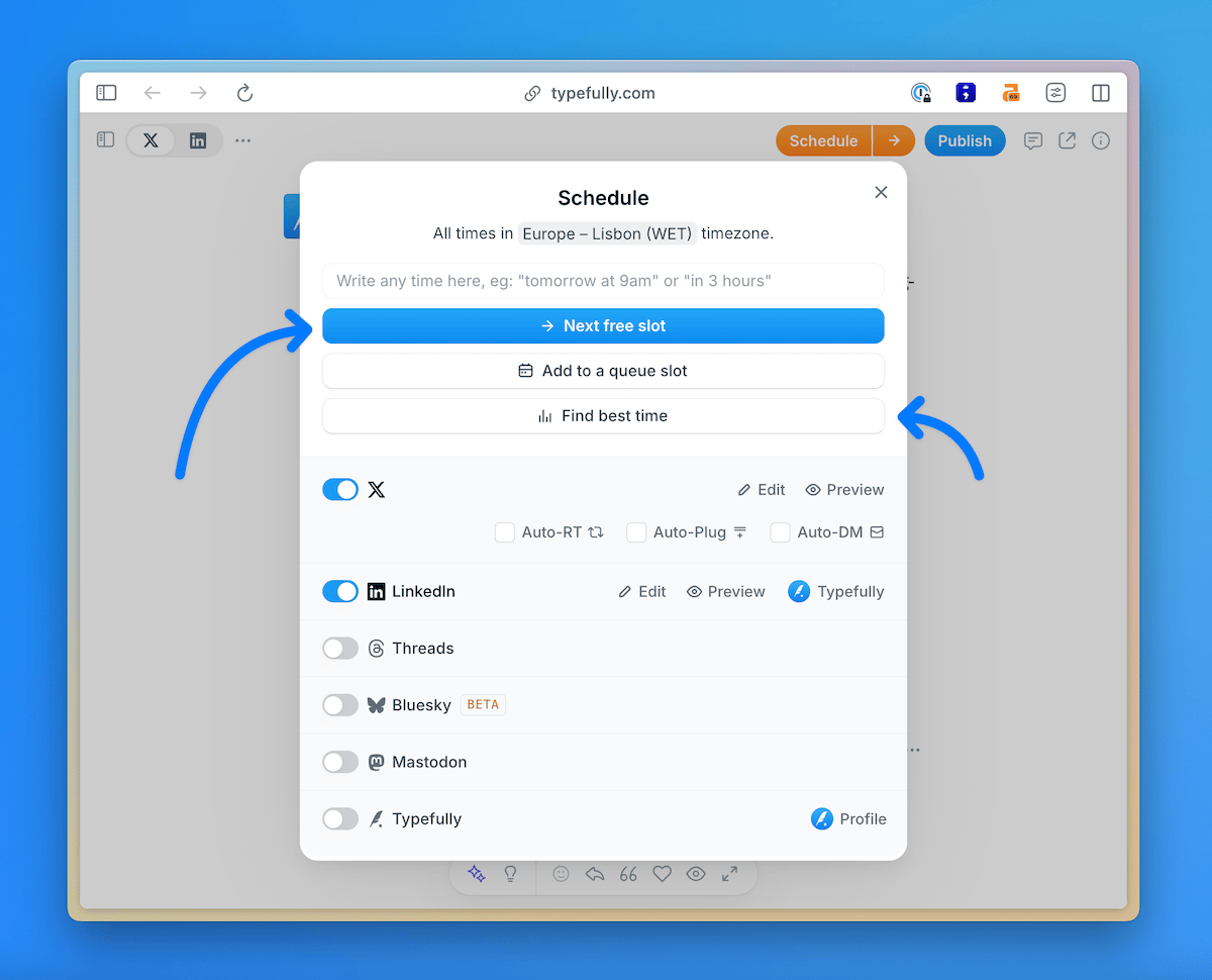 Discover how Typefully makes social media management effortless by letting you schedule posts across multiple platforms from one intuitive and beautiful tool. Whether you're managing your personal brand or a company's social presence, our social media scheduling features help you maintain a consistent posting schedule across multiple platforms.