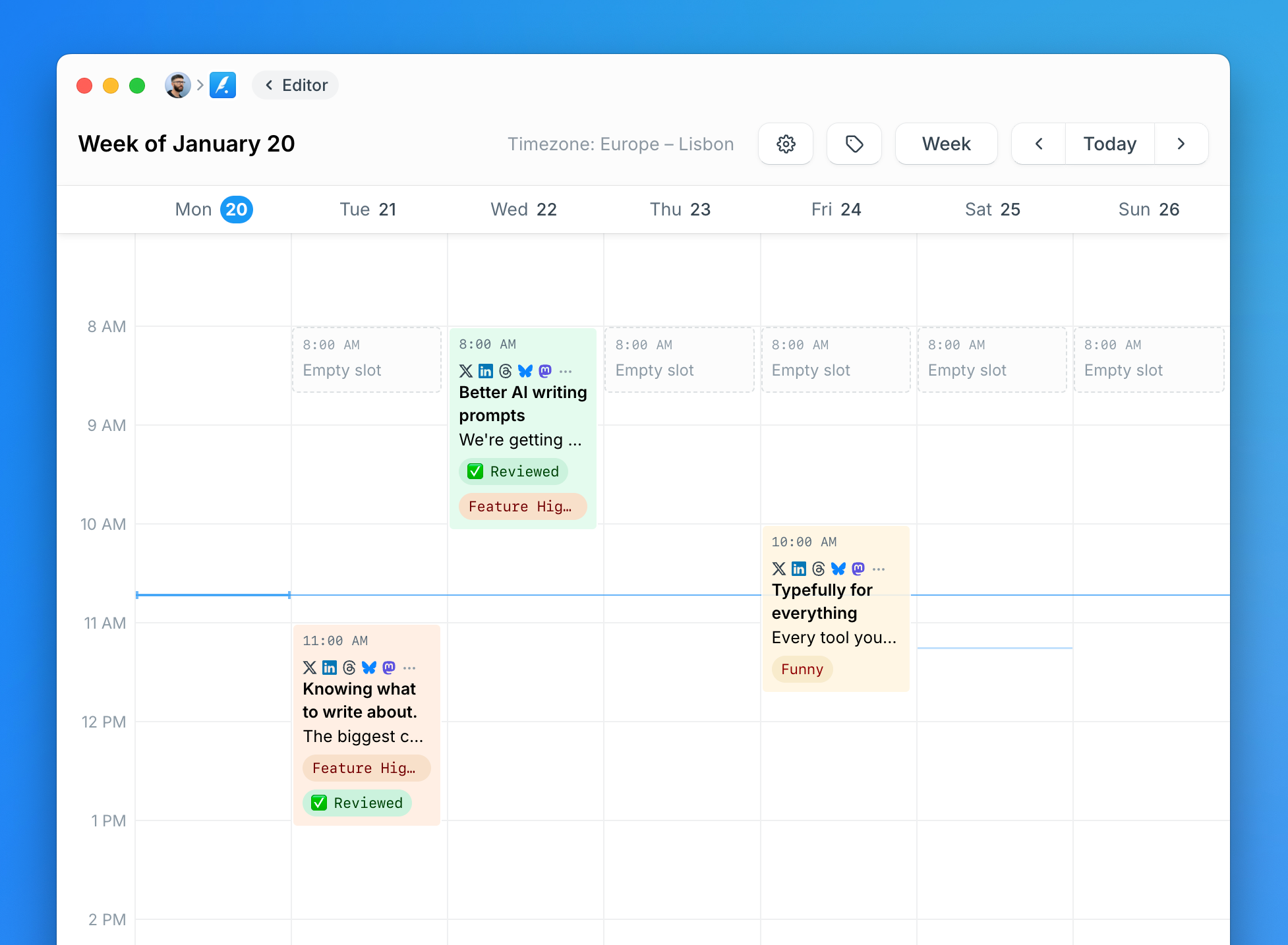 We support native scheduling on X, LinkedIn, Threads, Bluesky, and Mastodon. We are constantly adding new ones so you'll soon see other platforms like Facebook, Instagram, and TikTok as well.