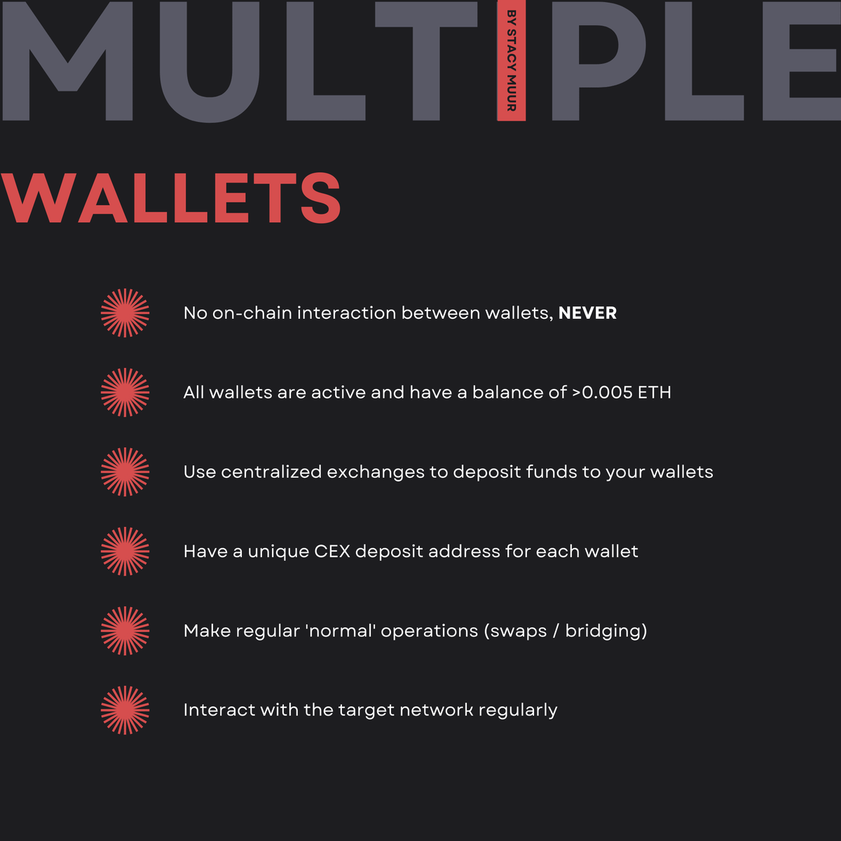 โ Use CEXes to send funds between wallets and regularly change deposit addresses. Sending funds to the same CEX deposit address is one of the activities pointing our a Sybil address cluster.