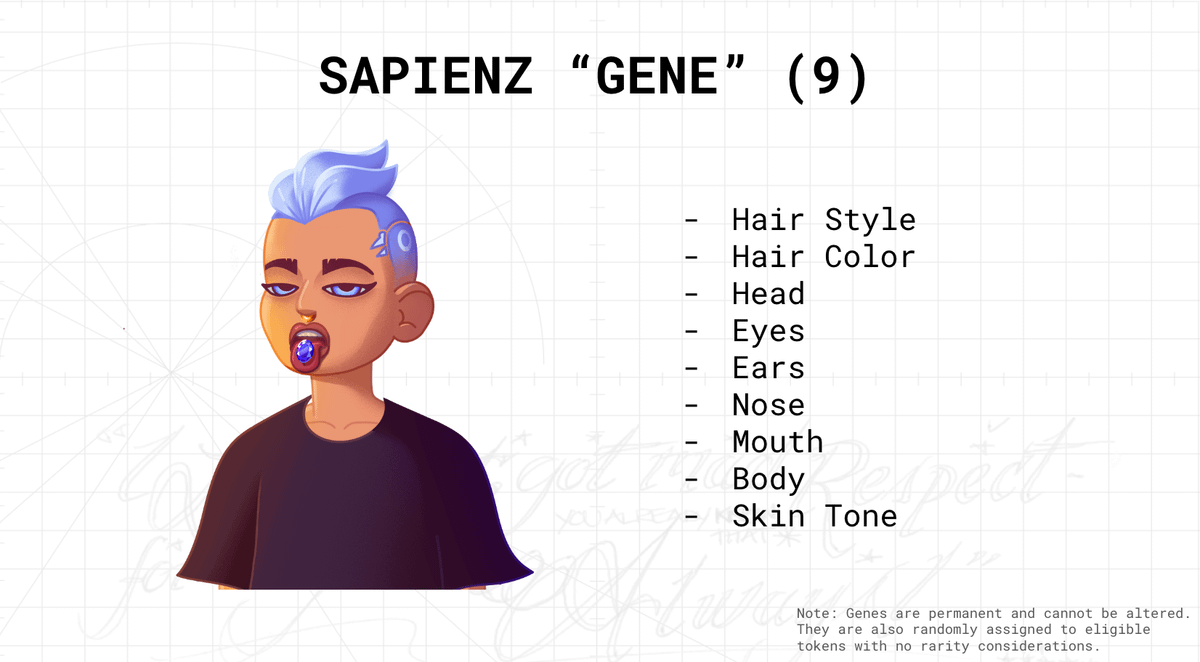 Now, let us dive into some rarity, perks and information about traits! SAPIENZ themselves are made up of SAPIENZ Gene traits that are permanent and cannot be altered as well as SAPIENZ Gear traits which can be traded, changed, equipped.