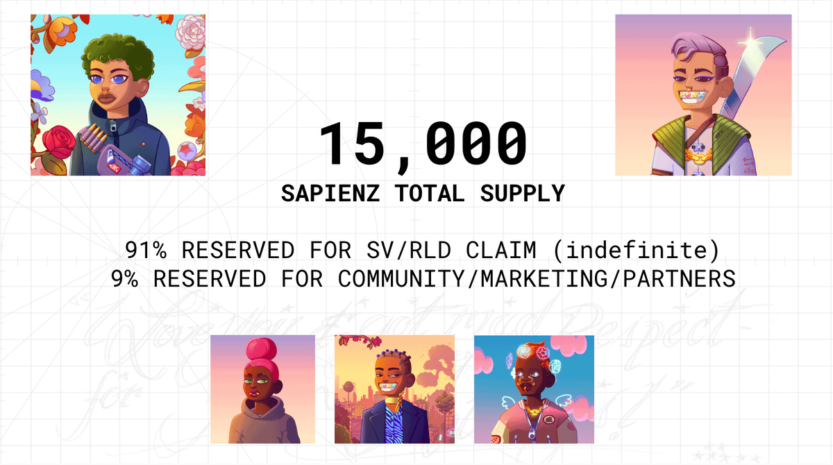 There will be a TOTAL of 15,000 SAPIENZ available in the drop. 91% is reserved for Stapleverse and Rhymezlikedimez communities to claim and 9% will be reserved for community and marketing activations, as well as partners.