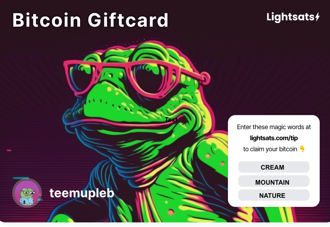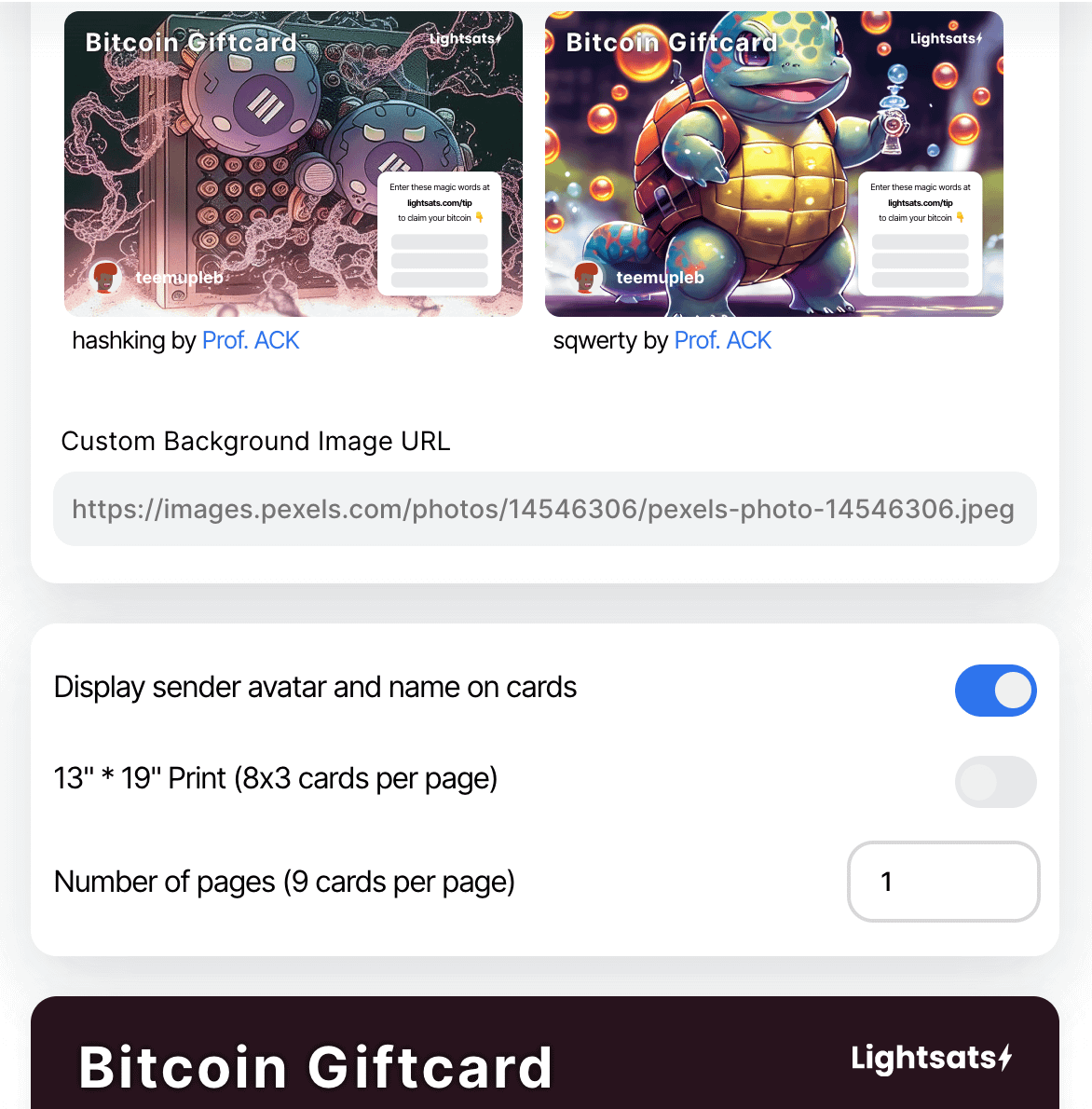 Lightsats also makes it possible to give credit card sized physical Bitcoin gift cards with a custom background URL.