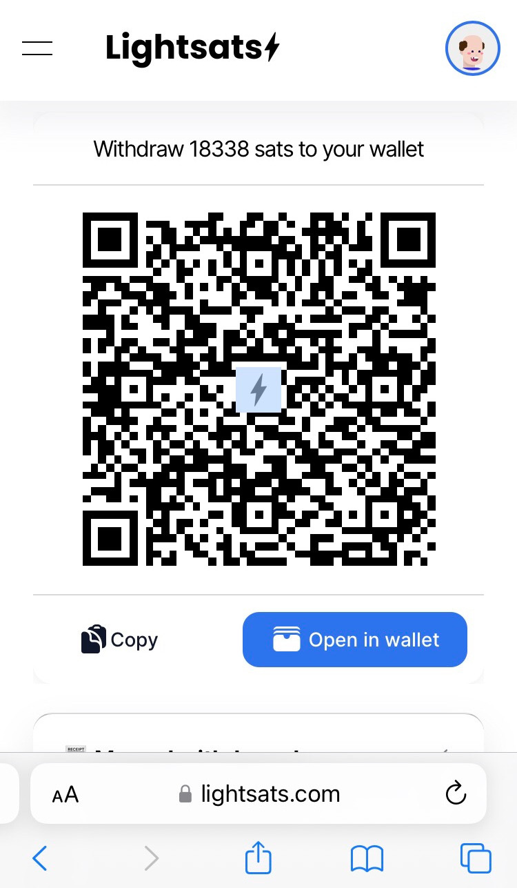 The person receiving the tip scans the QR code or copies the Lightning invoice.