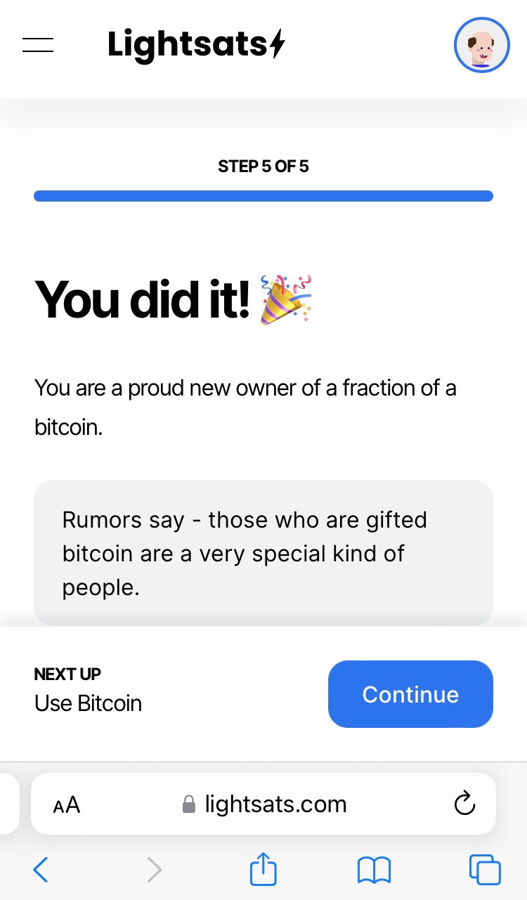 Once I have redeemed the gifted Bitcoin, I can click "Continue" and start learning about Bitcoin.