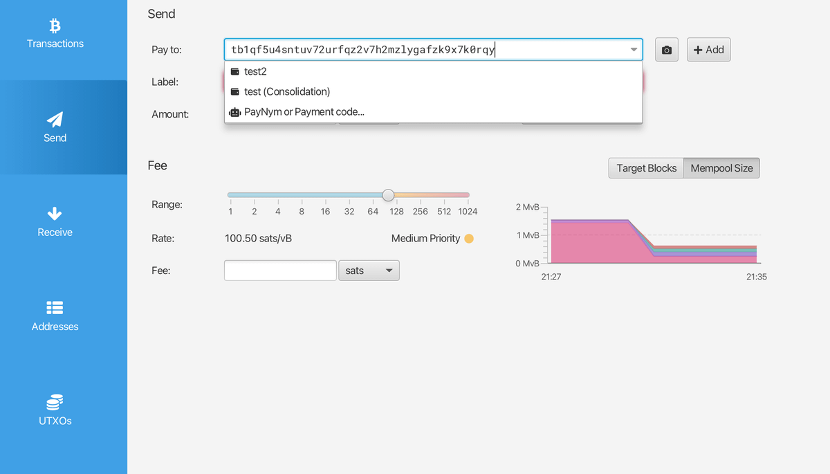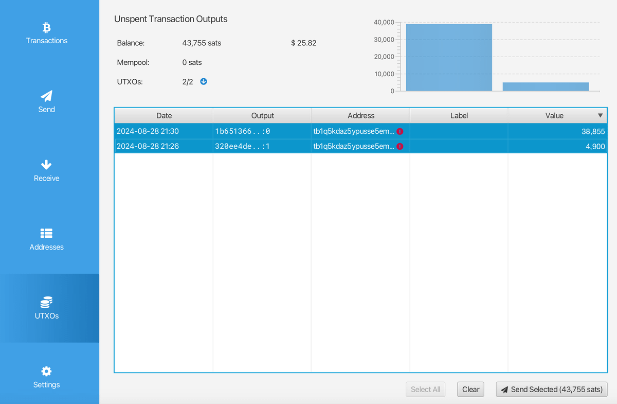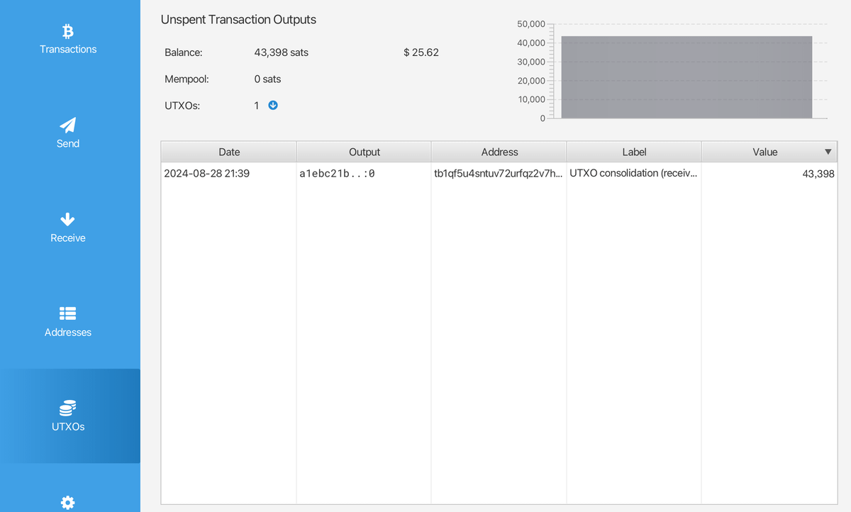 When you go back to the "UTXOs" tab, you can see that you now only have one larger UTXO, but the same amount of BTC (minus the miner fee).