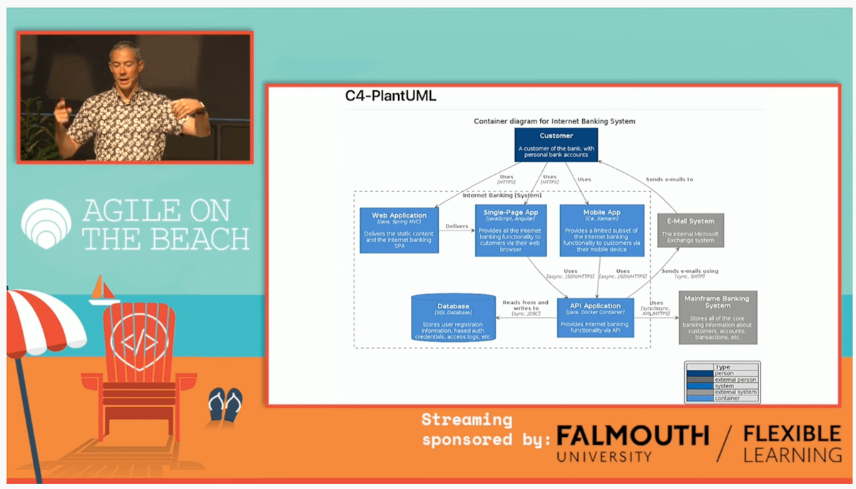 Agile on the Beach 2019 - Visualising Software Architecture with the C4 model by Simon Brown (@simonbrown) → Link: youtu.be/x2-rSnhpw0g Simon is also the author of the C4 Model, one of the best Architecture Models that I know, what UML was never able to be.