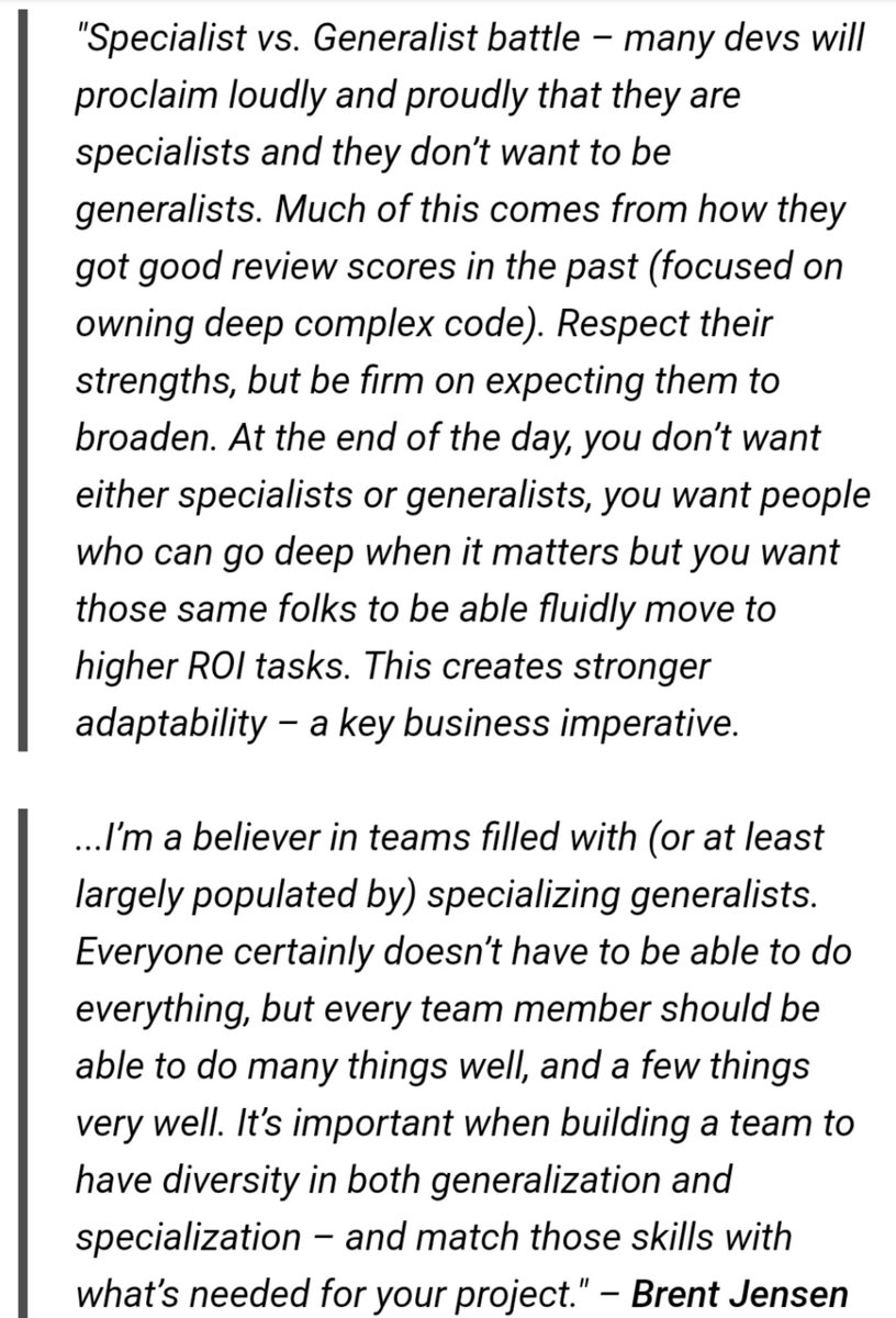 "..at the end of the day, you don’t want either specialists or generalists, you want people who can go deep when it matters but you want those same folks to be able fluidly move to higher ROI tasks. This creates stronger adaptability – a key business imperative." @BrentMJensen