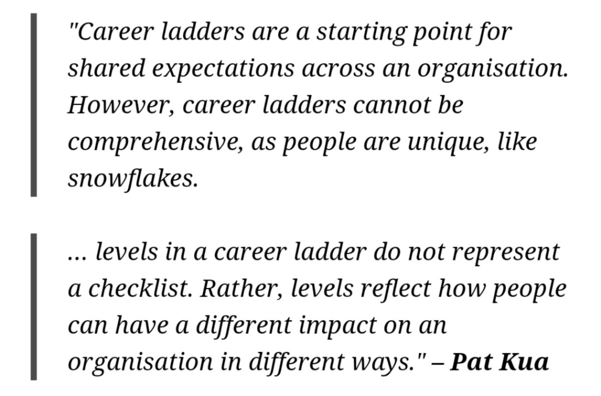 "Career ladders are a starting point for shared expectations across an organisation. However, career ladders cannot be comprehensive, as people are unique, like snowflakes. ..." @patkua