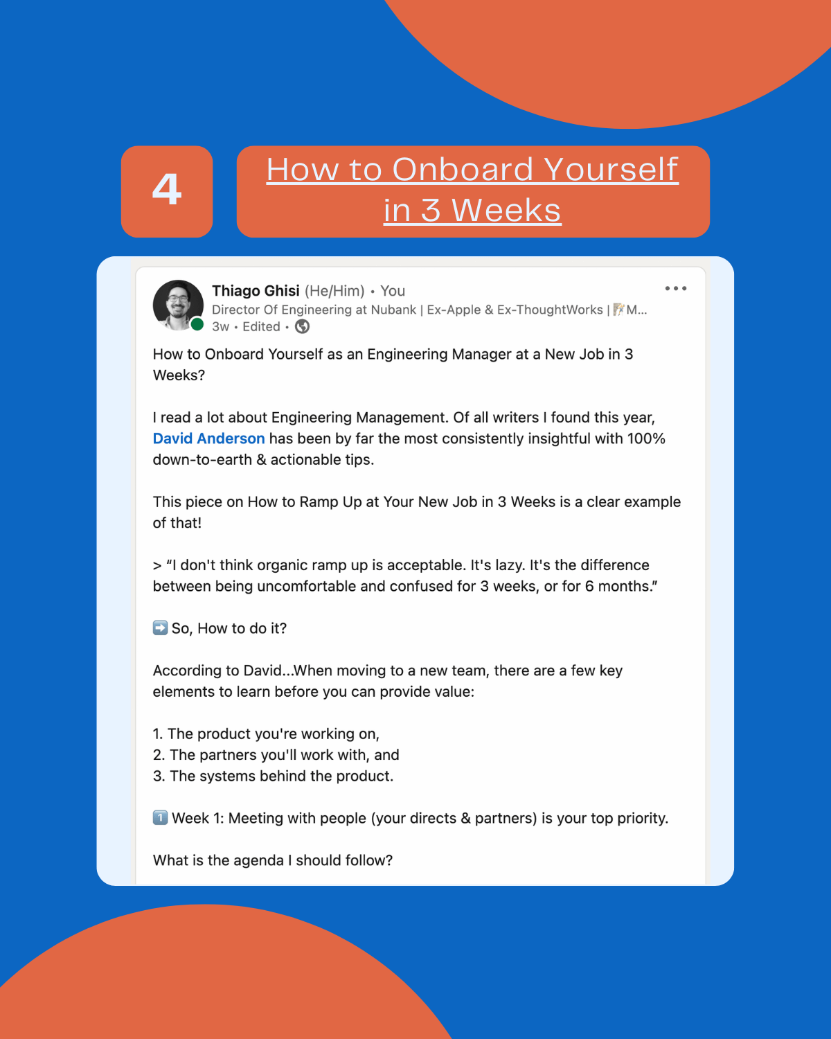 One of the most actionable ideas I came across on how to speed up your own onboarding process as an Engineering Manager by @scarletinked.