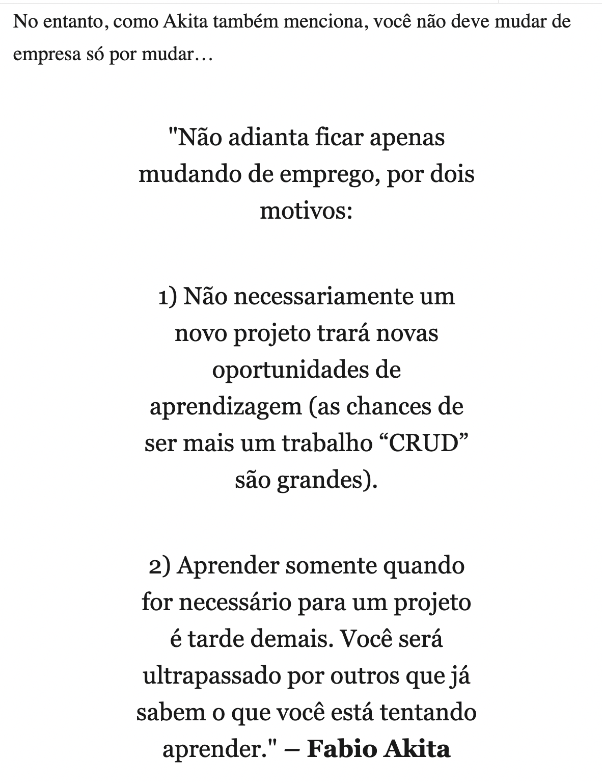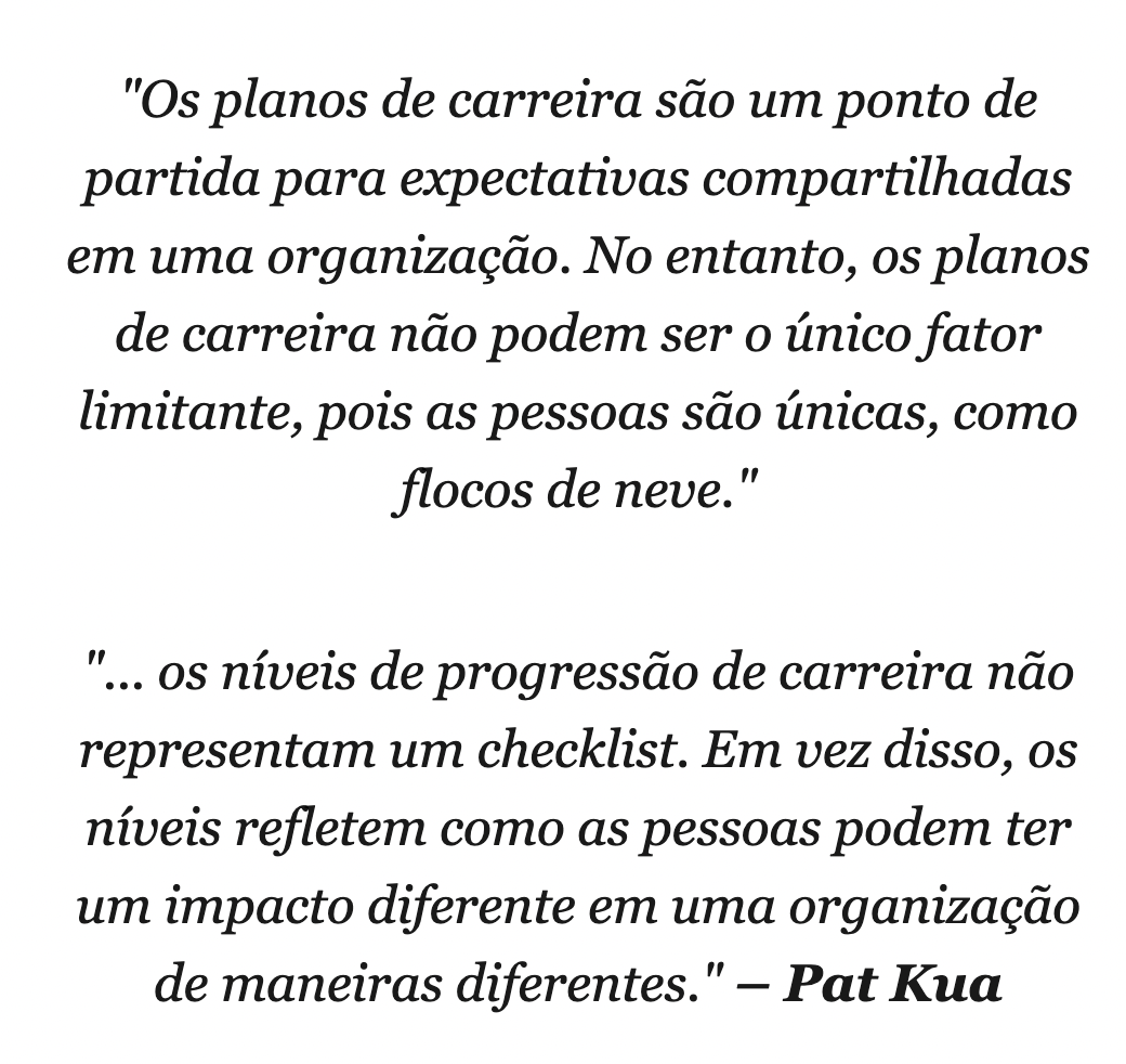 "Os planos de carreira são um ponto de partida para expectativas compartilhadas em uma organização. No entanto, os planos de carreira não podem ser o único fator limitante, pois as pessoas são únicas, como flocos de neve..." – @patkua