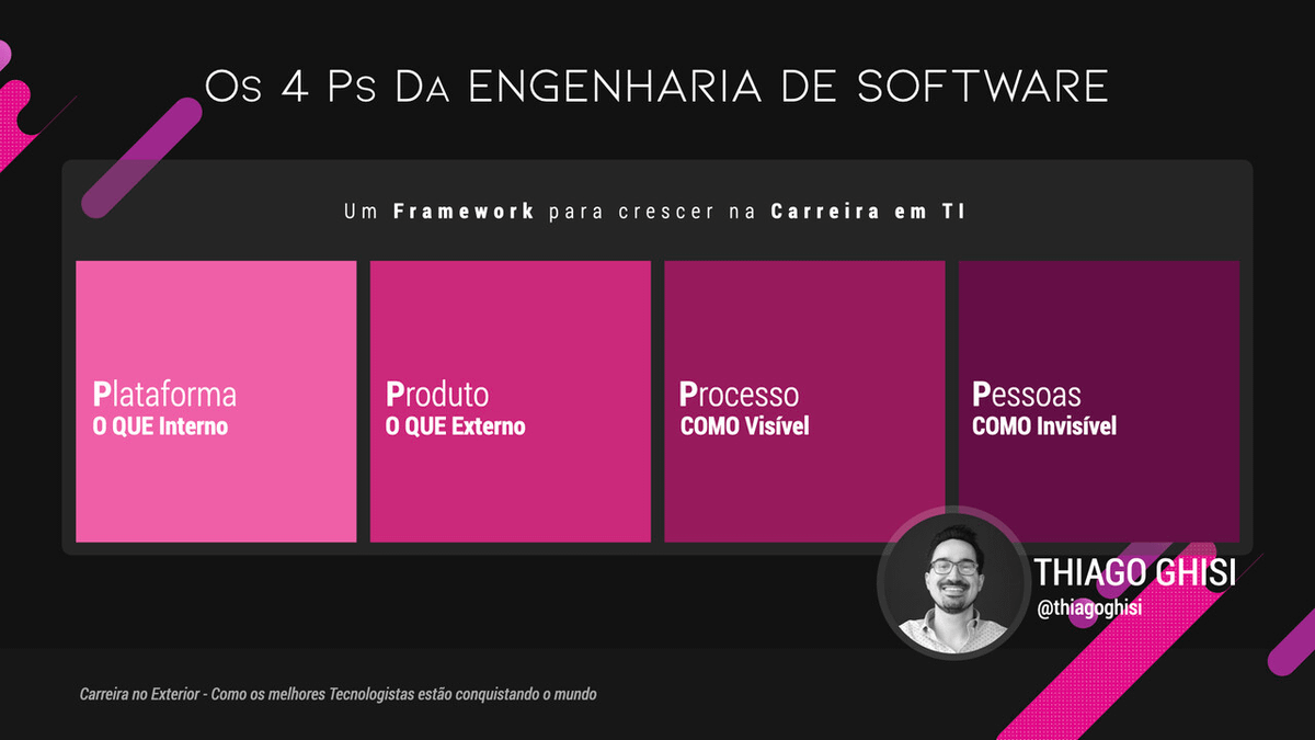 Os profissionais de sucesso que conheço se concentram em melhorar e aumentar seu impacto e influência não só no 1º P - Plataforma - que é o mais comum quando se pensa em Engenharia de Software, mas em todos os 4Ps: Plataforma, Produto, Processo e Pessoas.