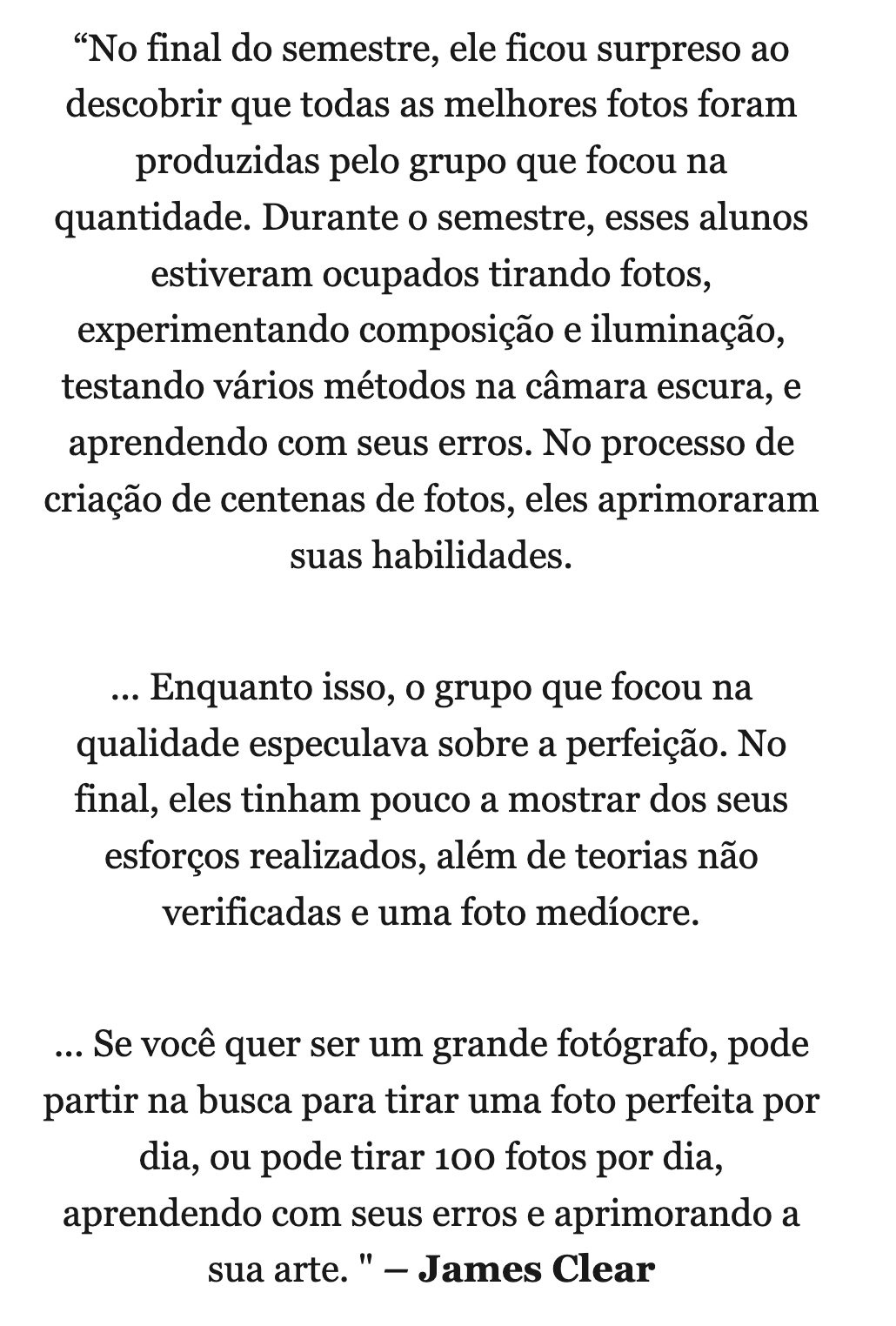 "Quando se trata de "aprimorar suas habilidades", focar na quantidade de repetições muitas vezes será mais importante do que focar na qualidade dessa repetições" – @JamesClear
