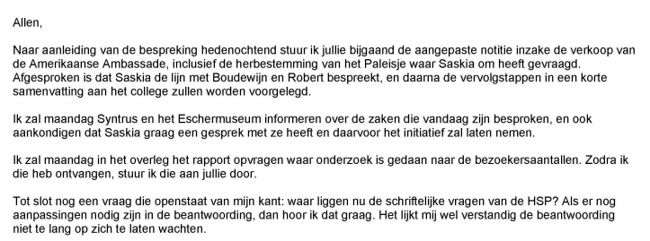 Richard de Mos het vrijkomende paleis graag onderhands verkopen. ( bijlage 2, p41) - Aan Maya Meyer die ook Paleis Soestdijk onder haar hoede heeft.