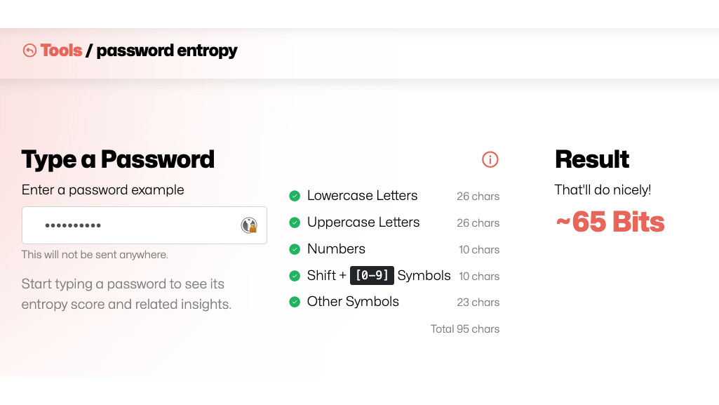 Przy klasycznym podejściu i haśle spełniającym wymogi poziomu skomplikowania (duże litery, małe, cyfry itd), Basia osiągnęła moc hasła równą 65 bitów. Do tego ma trudne do zapamiętania hasło: