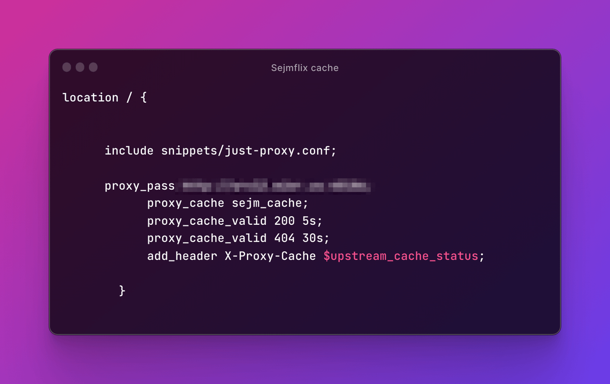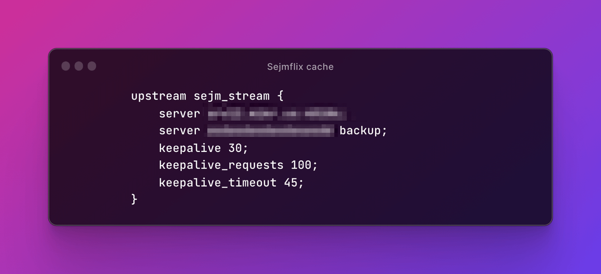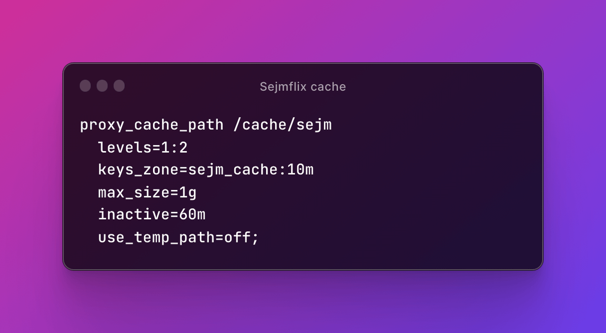 Początkowo, każdy odwiedzający 'Sejmflix' generował kilka requestów, co przemnożone przez liczbę odwiedzających dawało kilka milionów zapytań, które musiały zostać dostarczone do pierwotnego backendu. Obsługa ruchu z sejmflixa konsumowała około 12 GB RAM.