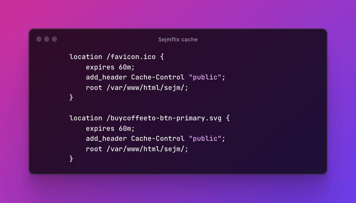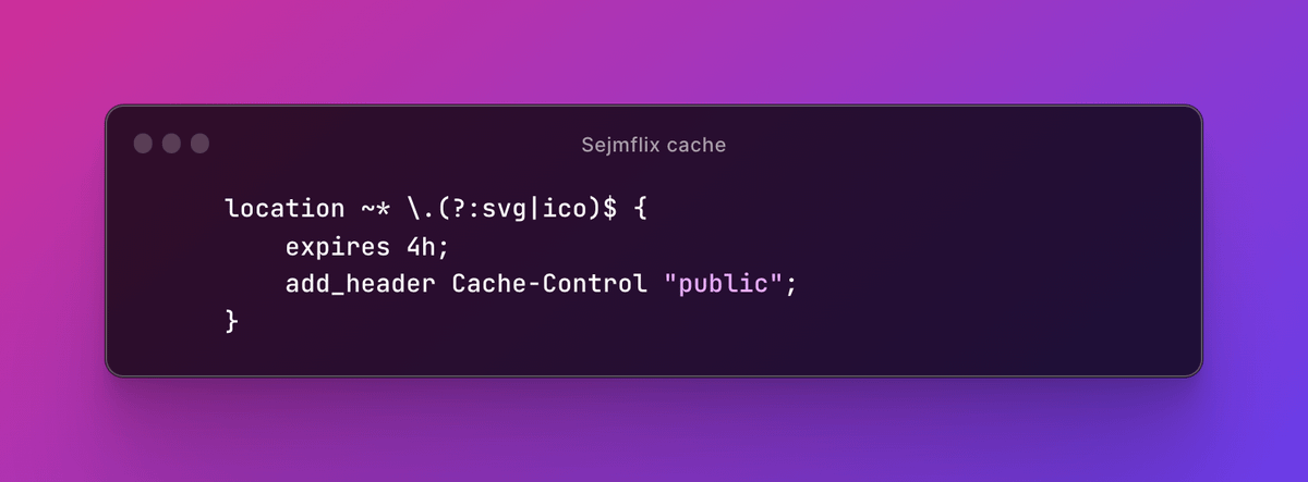 Aby Cloudflare działał optymalnie, warto też powiedzieć mu, co i na jak długo może cachować. Tutaj pomogło dodanie nagłówków cachujących. Jako że na stronie zostały już tylko pliki SVG i ICO, to one poszły do mocnego, 4-godzinnego cache.