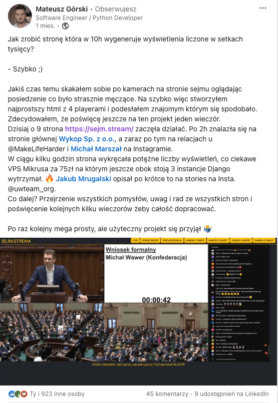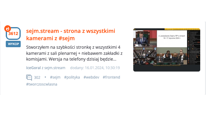 Jeden z użytkowników uruchomił na Mikrusie (mikr.us) portal, który miał służyć łatwemu oglądaniu transmisji sejmowych z wielu kamer jednocześnie. Właściciel nie przewidział jednak, z jak wielkim zainteresowaniem spotka się jego rozwiązanie.