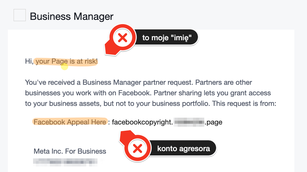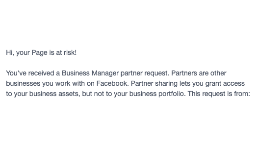 Po pierwsze, tytuł wiadomości informuje mnie o chęci nawiązania współpracy biznesowej. Tymczasem w treści czytam "your Page is at risk!".