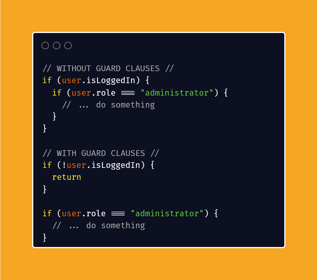 • Guard clauses are a great way to prevent nested if..else by using the "return early" approach.