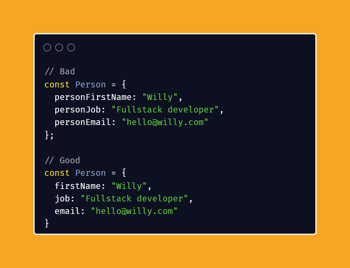 • If you class or object is self explanatory and tells you something, then you don't need to repeat in its method or variable name.