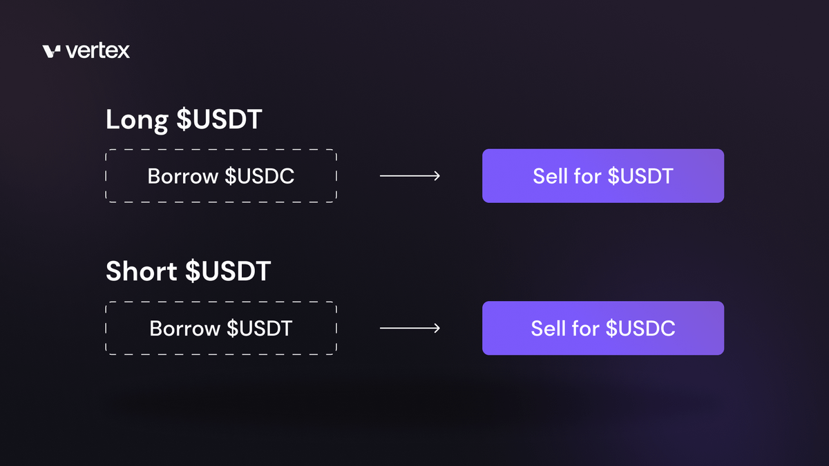 Leveraged Spot enables users to go Long or Short on a stablecoin by making use of Vertex's integrated Money Market & USDT-USDC spot market.